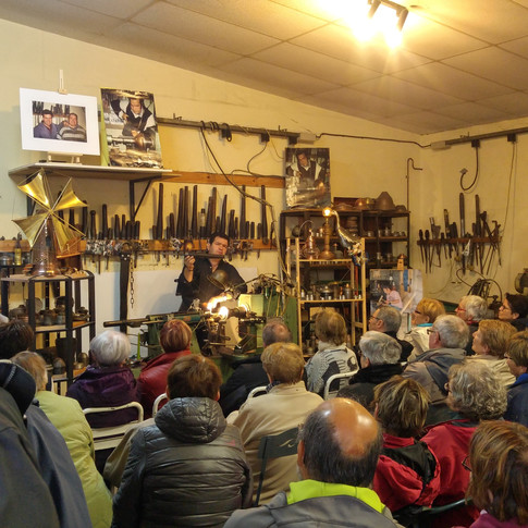 Vendredi 14 octobre - Il pleuvait averse lorsque les cars ont déposé les participants à la randonnée à Lucey, mais il en aurait fallu plus pour arrêter 48 irréductibles qui ont parcouru les deux marches programmées, ni entamer la bonne humeur des autres qui ont trouvé refuge au restaurant pour une matinée "jeux de société". A 12h30 tout le monde s'est retrouvé autour de la table au restaurant La Paillère à Lavours pour un savoureux repas, suivi par une visite de la cuivrerie locale avec commentaires et démonstrations du maître dinandier et bien sûr un peu de shopping.