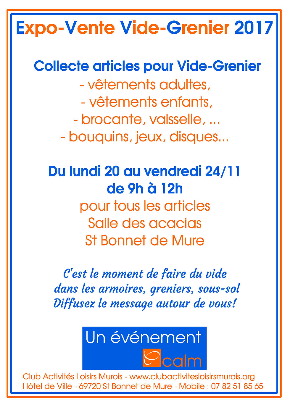Chaque année, le dernier week-end de novembre, le CALM organise une Expo-Vente Vide-Grenier.